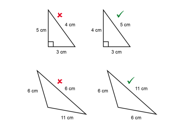 - The sum of the lengths of the two shorter sides of the triangle must be greater than the length of the longest side of the triangle.