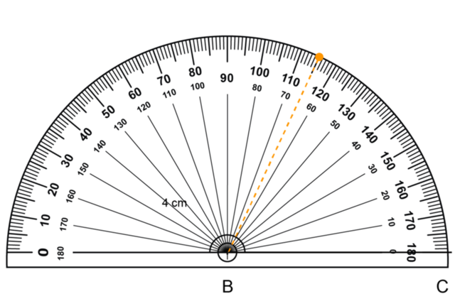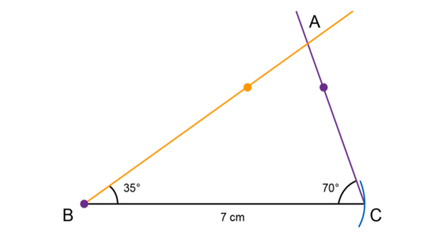 Put the origin of the protractor on point \(C\). On the protractor, use the outer scale from the left and find \(70^{\circ}\). Make a small dot at the edge of the protractor.