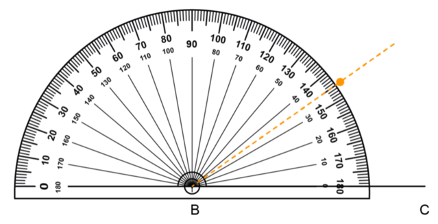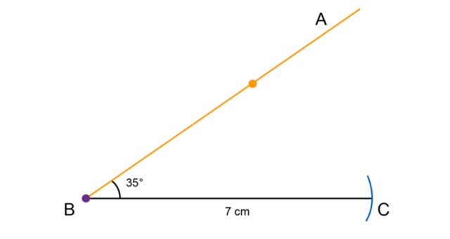 Put the origin of the protractor on point \(B\). Use the inner scale of the protractor to find \(35^{\circ}\). Make a small dot at the edge of the protractor and then draw a line through the dot and point \(B\).