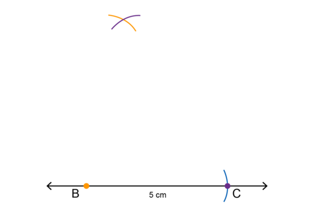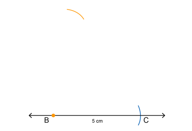 Draw a line segment (longer than \(5 \text{ cm}\)) and mark point \(B\). Use a compass to measure a length of \(5 \text{ cm}\) on your ruler. Keeping the compass width the same, place the compass on point \(B\) and draw a small arc to mark off a length of \(5 \text{ cm}\). Label the point \(C\).