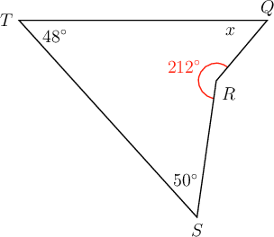 In quadrilateral \(QRST\)is given. \(\hat{R} = 212^{\circ}, \hat{S} = 50^{\circ}\) and \(\hat{T} = 48^{\circ}\). Find the value of \(x\), giving a reason for your answer.