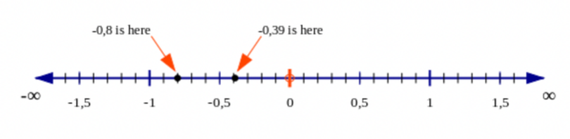 \(- \text{0,8} < - \text{0,39}\).