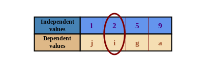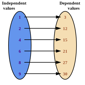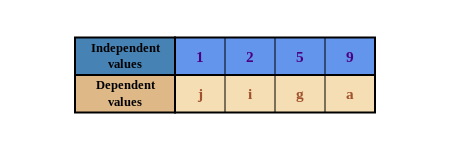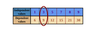 A table of values lists two groups of numbers. This table lists the independent values in the top row, and the dependent values in the bottom row. The numbers that are above and below each other make a special pair.