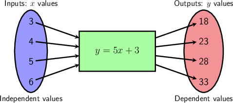 Long ago, mathematicians started to use the convention of using the letter symbol \(x\) as an abbreviation for the input number, and the letter symbol \(y\) as an abbreviation for the output number.