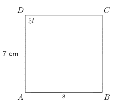 \(ABCD\) is a square with \(\hat{D} = 3t\), \(AB = s\) and \(AD = 7 \text{ cm}\).