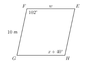 \(EFGH\) is a rhombus with \(\hat{H} = x + 40^{\circ}\), \(\hat{F} = 102^{\circ}\), \(FE= w\) and \(FG = 10 \text{ m}\). Find the values of \(x\) and \(w\).