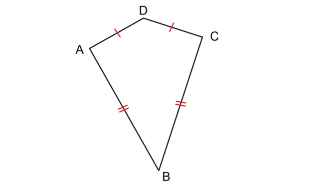 A kite is a quadrilateral with two pairs of adjacent sides equal. In kite \(ABCD\), the two shorter adjacent sides are equal, \(AD = CD\), and the two longer adjacent sides are equal, \(AB = CB\).