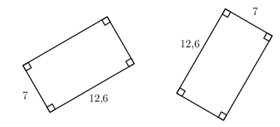 \[\triangle ABC \equiv \triangle DEF\]For two quadrilaterals to be congruent, their corresponding angles must be equal and their corresponding sides must be the same length. The diagram below shows two congruent rectangles. Their corresponding sides are the same length: \(7\) units and \(\text{12,6}\) units, and their corresponding angles are equal: \(90^{\circ}\). Notice that we could rotate one of the rectangles and it would fit exactly on top of the other rectangle.