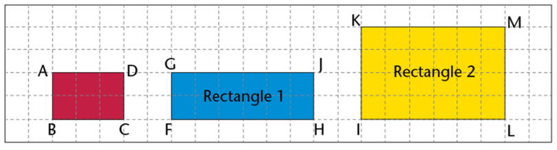 The diagram shows three rectangles. For rectangle \(ABCD\), \(AB = 2 \text{ units}\), \(AD = 3 \text{ units}\) and \(\hat{A} = \hat{B} = \hat{C} = \hat{D} = 90^{\circ}\). Is rectangle 1 similar to rectangle \(ABCD\)? Or is rectangle 2 similar to rectangle \(ABCD\)? We know that the interior angles are all the same (right angles), so we need to find out which rectangle has sides in the same proportion to rectangle \(ABCD\).