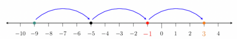 We must start at \(−9\) and count forwards (to the right) in \(4\)s.