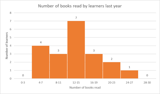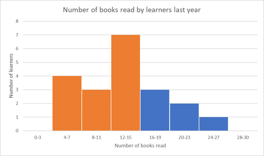 To find the number of learners who read more than \(15\) books last year, we must add the values for the bins where the number of books is greater than \(15\) (shown in blue below).