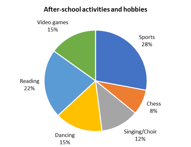 Sports \((28 \%)\); Reading \((22 \%)\); Video games \((15 \%)\); Dancing \((15 \%)\); Singing/choir \((12 \%)\); Chess \((8 \%)\)