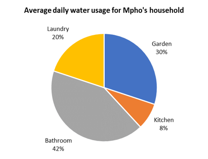 - Mpho’s household uses, on average, \(450\) litres of water per day. How many litres are used for laundry?
