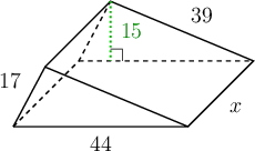 \[\begin{align} \text{Volume of prism} &= 1\ 650 \text{ cm}^3 \\ 1\ 650 &= \frac{1}{2} (44 \times 15) \times x \\ 1\ 650 &= 330x \\ 5 &= x \end{align}\]Write the final answer.