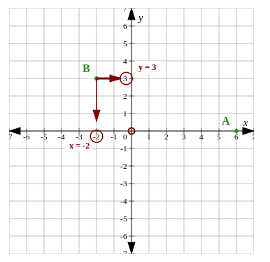 To find the \(x\)-value, we read how many units on the \(x\)-axis point \(B\) is left or right of the