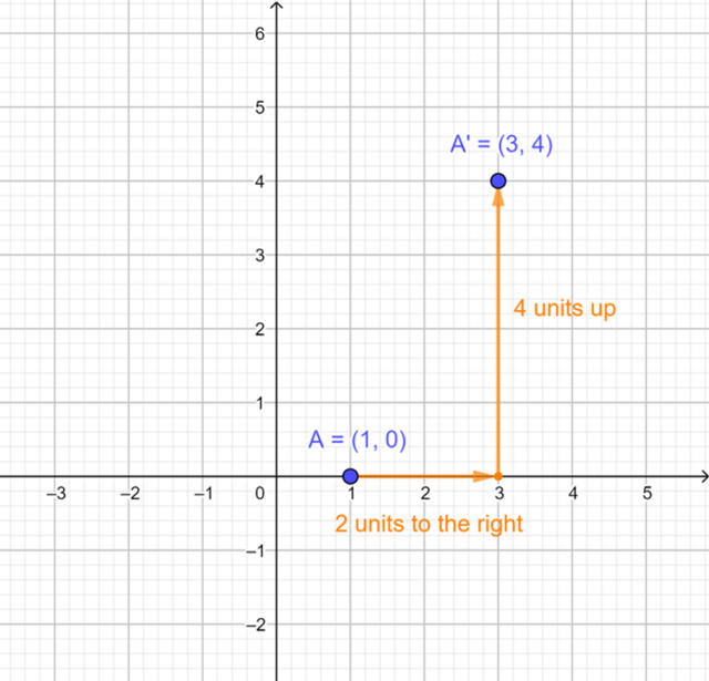 We can translate a point on the Cartesian plane from one position to another. For example, point \(A(1; 0)\) is translated 2 units to the right and 4 units upwards.