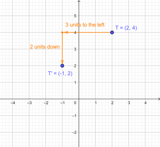 Write down the coordinates of \(T'\) if \(T(2; 4)\) is translated \(3\) units to the left and \(2\) units downwards.