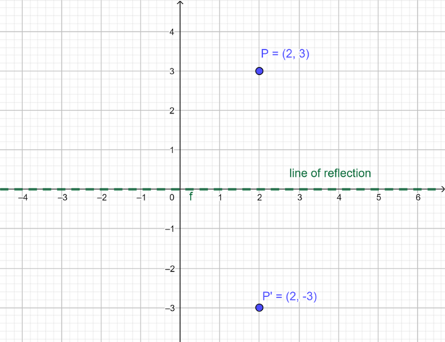 Reflecting \(P(x; y)\) in the \(x\)-axis produces image \(P'(x; -y)\):