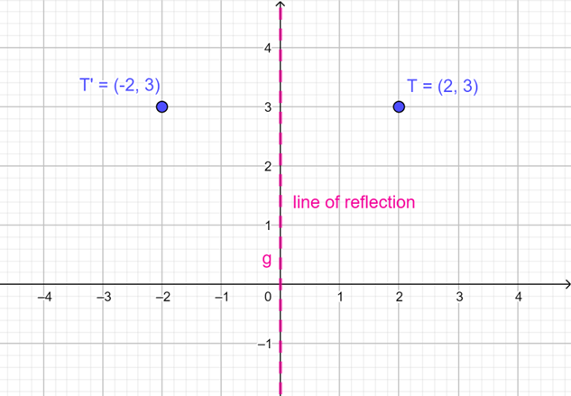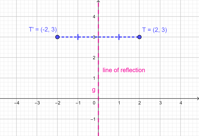 \[(x; y) \rightarrow (-x; y)\]We notice that the point and its image are the same perpendicular distance from the line of reflection. In other words, there is symmetry with respect to the line of reflection. In the diagram, \(T\) is 2 units from the \(y\)-axis and \(T'\) is also 2 units from the \(y\)-axis.
