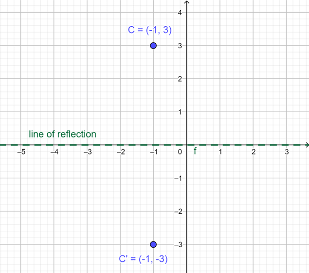 We need to reflect \(C\) in the \(x\)-axis (that is, in the line \(y = 0\)). We know that by reflecting a point in the \(x\)-axis to get its image, the value of the \(x\)-coordinate stays the same and the value of the \(y\)-coordinate changes its sign.