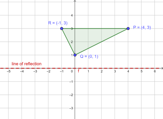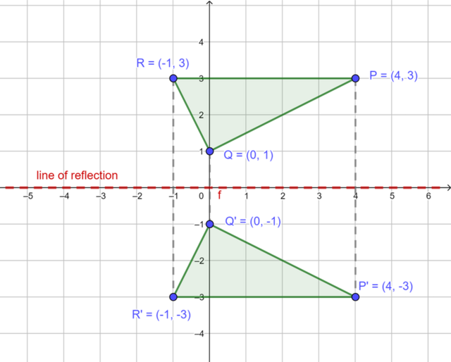 We can reflect \(\triangle PQR\) in the \(x\)-axis (\(y=0\)) to produce the image \(\triangle P'Q'R'\). To find the corresponding coordinates of the image of reflection in the \(x\)-axis, we keep the value of the \(x\)-coordinate the same and change the sign of the \(y\)-coordinate.