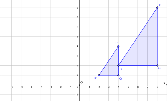 The diagram shows \(\triangle PQR\) and its image \(\triangle P'Q'R'\) under a reduction transformation with the origin as the centre of reduction.