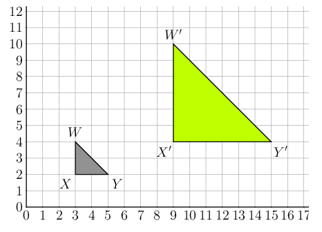 \[ \begin{align*} \frac{X'Y'}{XY} &= \frac{15 - 9}{5 - 3} \\ &= \frac{6}{2} \\ &= 3 \end{align*} \]We can calculate the lengths of the vertical sides \(XW\) and \(X'W'\) by subtracting the values of the corresponding \(y\)-coordinates.