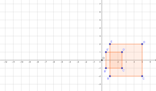 The diagram shows square \(BCDE\) and its image \(B'C'D'E'\) under a reduction transformation with the origin as the centre of reduction.