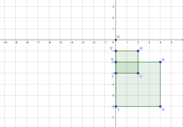 The diagram shows square \(QTSR\) and its image \(Q'T'S'R'\) under a reduction transformation with the origin as the centre of reduction. Find the scale factor.