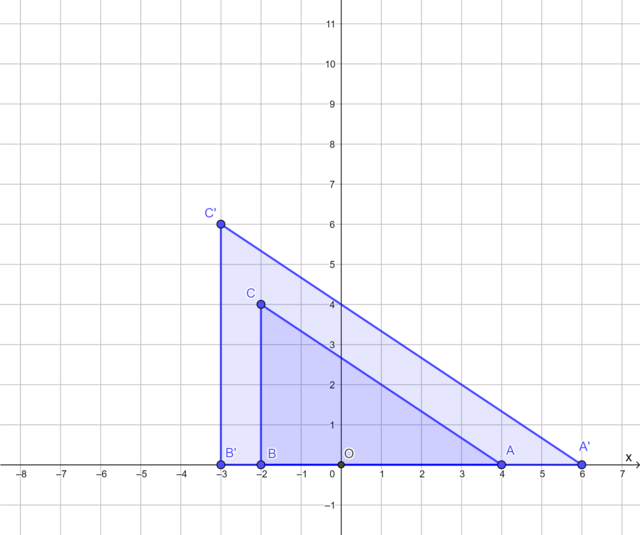 The diagram shows \(\triangle ABC\) and its image \(\triangle A'B'C'\) under an enlargement transformation with the origin as the centre of enlargement. Determine the scale factor.