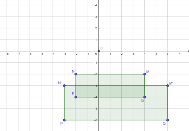 The diagram shows rectangle \(MNPQ\) and its image \(M'N'P'Q'\) under an enlargement transformation with the origin as the centre of enlargement. Find the scale factor.