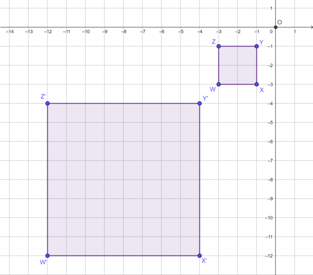 The diagram shows square \(WXYZ\) and its image \(W'X'Y'Z'\) under an enlargement transformation with the origin as the centre of enlargement. Find the scale factor.