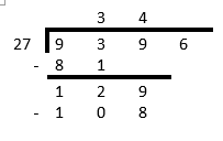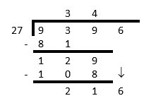 Use long division method to find the answer to \(9\ 396 \div 27\).
