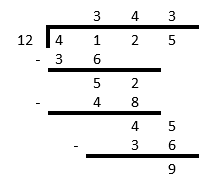 So, the answer is \(4\ 125 \div 12 = 343\) with a remainder of \(9\).