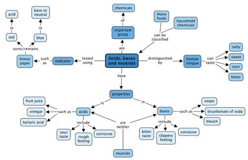The human tongue can taste 4 main different tastes. What are these? Fill them in the spaces below. You also need to complete the section of the concept map about indicators. Can you work out how to do this? You need to fill in the colour that litmus turns (or remains) in each either an acid or a base (or neutral).