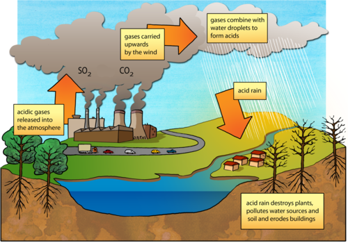 Which two gases are mentioned in the text and on the diagram which contribute to forming acid rain? [2 marks]