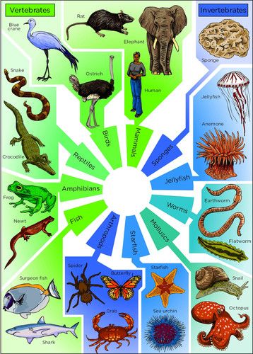 • The vertebrates are divided into five groups: Mammals, Birds, Reptiles, Fish and Amphibians.