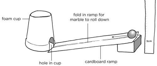 3. First set up the ramp so that the top of the ramp is at a height of 5cm. Roll the marble from a height of 5 cm and then measure how far the styrofoam cup moves.