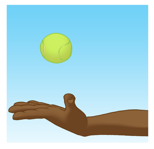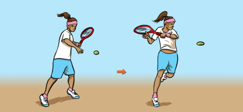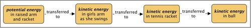 The tennis player's arm and racket have potential energy as they are raised. As the girl swings her arm, this potential energy is transferred to the tennis racket as kinetic energy. The tennis racket transfers energy to the ball as kinetic energy which enables the ball to move through the air.