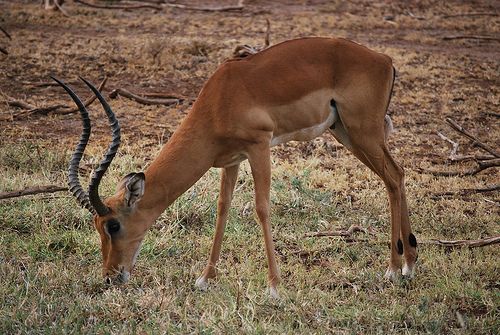 An impala eats the grass and stores the energy in its muscles. When the impala runs, the stored energy becomes kinetic energy.