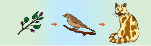 In the previous example showing the berries, the bird and the cat, we saw an example of a food chain. Do you remember learning about food chains in Gr. 6? A food chain only shows the transfer of energy between organisms, and does not include the Sun. So, it always starts with a producer. Is the image below an example of a food chain? Why or why not?
