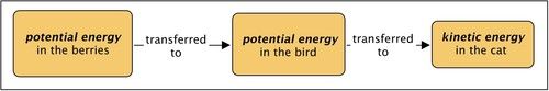 The berries have potential energy in them. The bird eats the berries and this energy is transferred to the bird as potential energy. Most of the energy is used by the bird and transferred as kinetic energy as it moves around. The bird is then eaten by a cat and the potential energy in the bird's flesh is transferred to the cat as potential energy which is then transferred to kinetic energy as the cat moves around and performs its life processes.