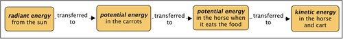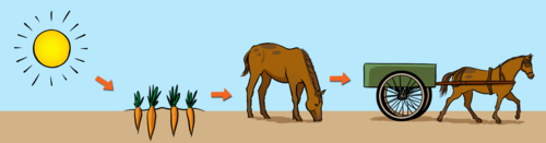 The energy from the Sun is transferred to potential energy within the carrots as they photosynthesize and produce food. The horse then eats the carrots and this potential energy is transferred to potential energy within the horse. The horse then moves and pulls a cart, so the potential energy in the horse is transferred to kinetic energy in the horse and in the cart as it moves along.