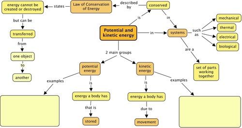 Teacher's version showing some examples of what learners could put in for potential and kinetic energy. There are many other examples too.