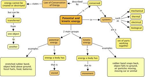 What we must focus on is systems which have different parts that learners can examine. It is sufficient to say that the potential energy in a system becomes the kinetic energy of some part of the system. We can have energy in a system in two forms - it can be stored in the system (potential energy) and it can cause changes in the system (kinetic energy). Therefore, the key concepts to focus on within these sections are: potential and kinetic energy, systems, transfer of energy between parts of a system and the conservation of energy.