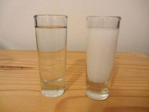 A clear, transparent solution on the left and an opaque emulsion on the right