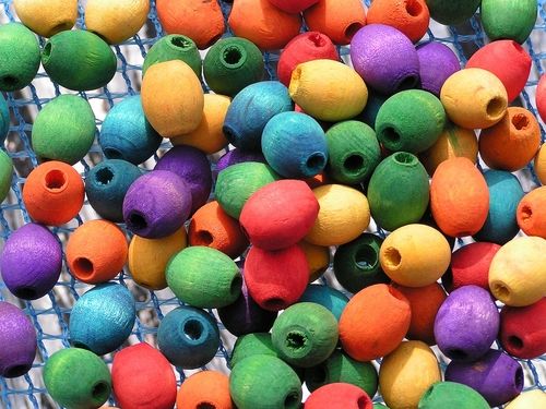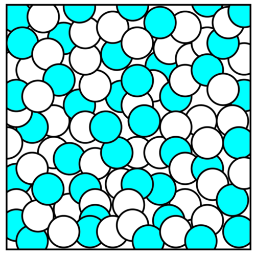 Particles in a solution. Notice that the blue particles are more or less evenly spaced amongst the white ones.