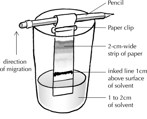 1. The diagram below shows a strip chromatogram that is being prepared from a spot of black ink. The strip on the left shows the chromatogram at the start of the experiment, the strip in the middle shows the chromatogram halfway through the experiment, and the strip on the right shows the chromatogram at the end of the experiment.