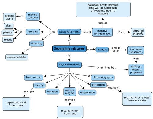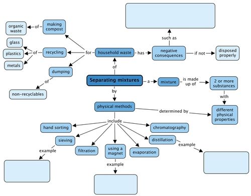 We looked at physical methods to separate mixtures and these are shown in the concept map. Give an example of the types of mixtures you could separate using three of these methods. What negative consequences does human waste have on the environment? Fill these in the concept map.