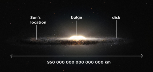 All the stars in this galaxy are revolving around the centre of the galaxy. Just as the Earth travels around the Sun, the Sun and our entire solar system is traveling around the centre of the Milky Way Galaxy at a speed of 250 km/s. Even though we are travelling incredibly fast, it takes the Sun about 225 million years to complete one orbit around the galaxy centre. The Milky Way is truly massive, measuring a staggering 950 000 000 000 000 000 km across!